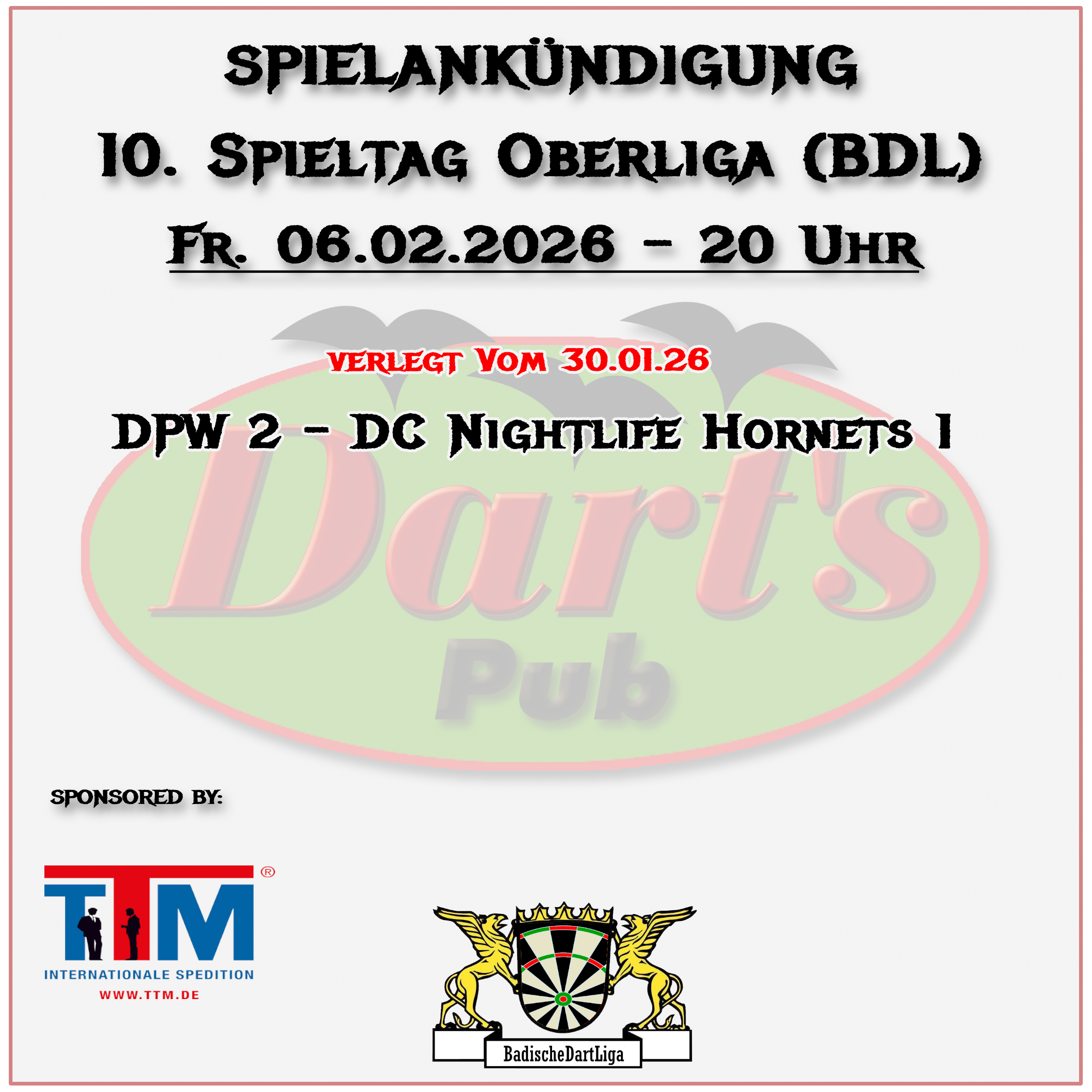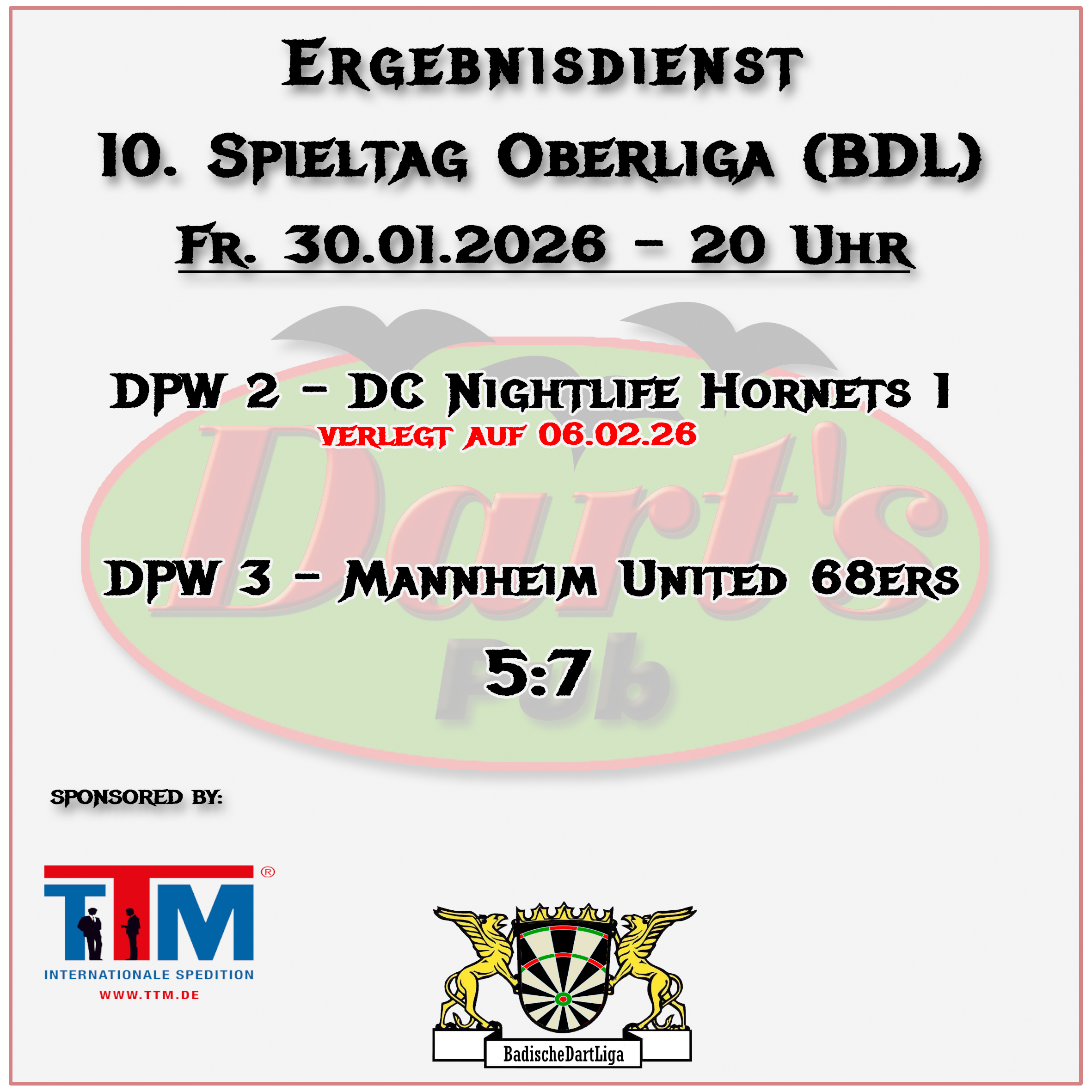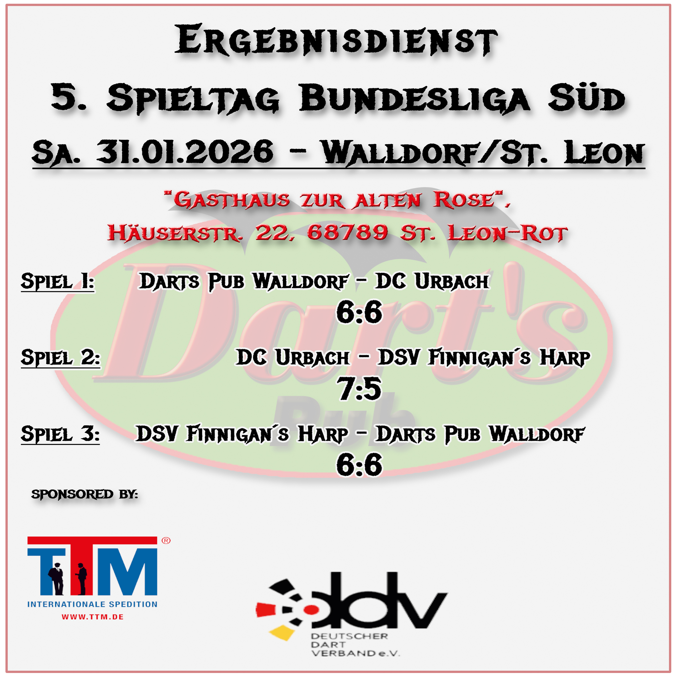 Alle Spielpläne der Ligen, an diesen der Darts Pub Walldorf teil nimmt, sind veröffentlicht worden. Bis zum kommenden Wochenende werden diese hier auch, wie üblich, zu finden sein. Wenn Ihr vorher schon die Pläne studieren möchtet, findet Ihr diese auf den jeweiligen Websites des DDV, BWDV und der BDL