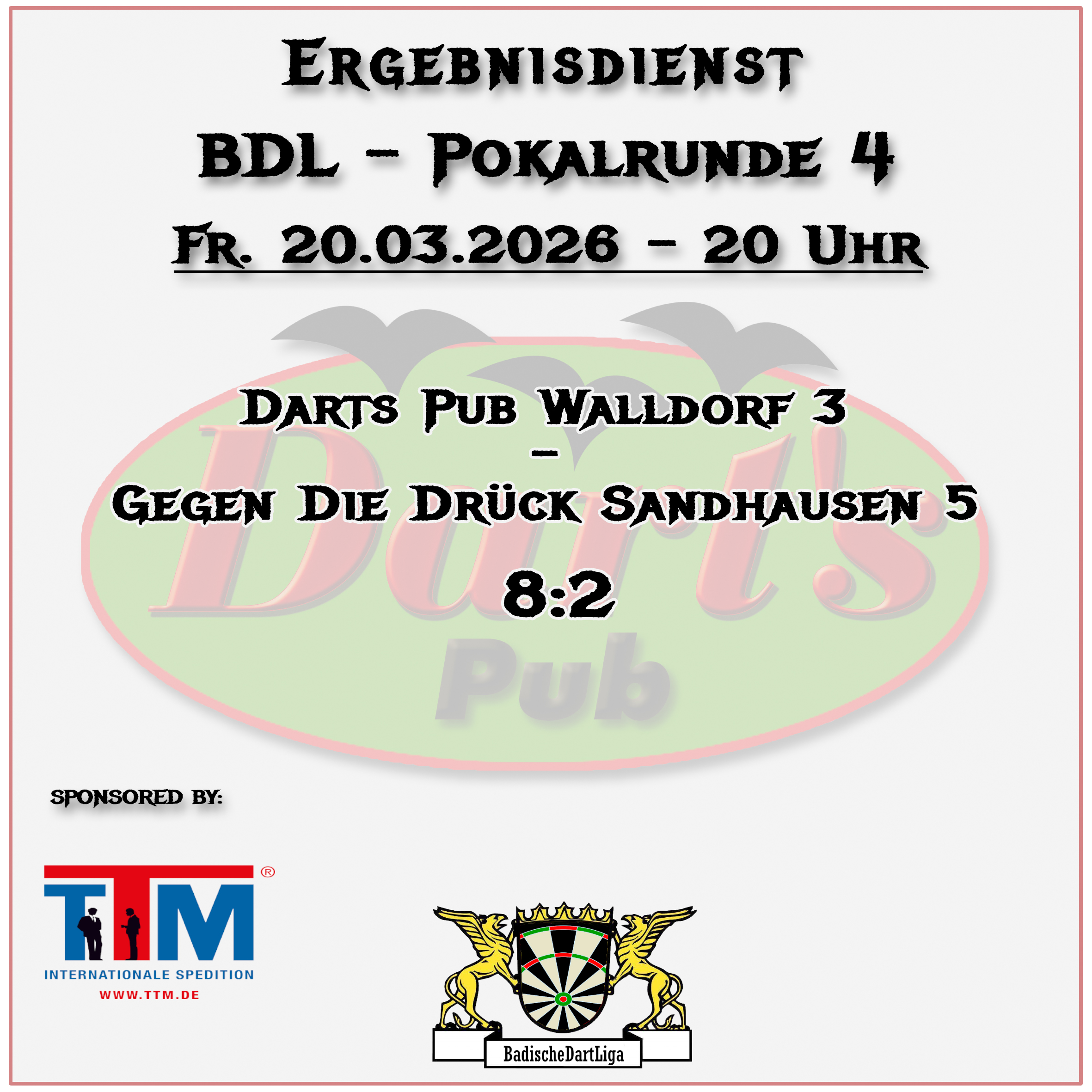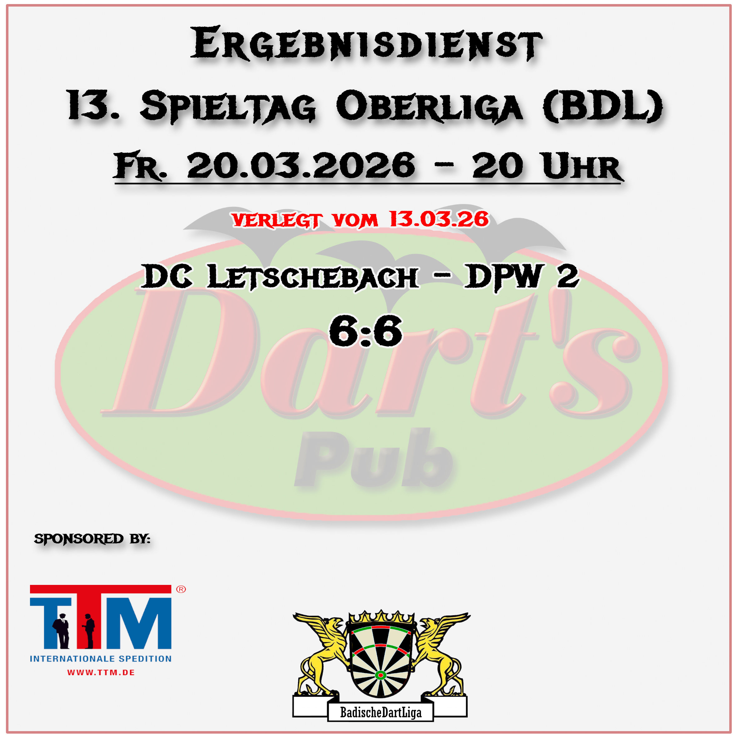 Alle Spielpläne der Ligen, an diesen der Darts Pub Walldorf teil nimmt, sind veröffentlicht worden. Bis zum kommenden Wochenende werden diese hier auch, wie üblich, zu finden sein. Wenn Ihr vorher schon die Pläne studieren möchtet, findet Ihr diese auf den jeweiligen Websites des DDV, BWDV und der BDL